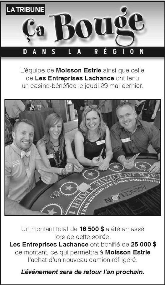 Dans La Tribune ce matin, Denis Messier revient sur le Casino Bénéfice organisé par Les Entreprises Lachance, qui a permis d’amasser pas moins de 85 000 $ ! Merci à tous ceux qui ont fait de cette soirée une réussite !