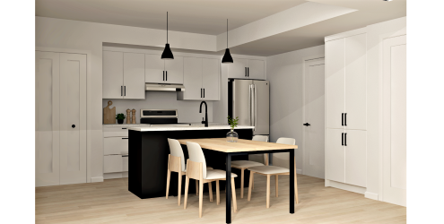 -Cuisine moderne incluant une table de salle à manger intégrée à l’îlot de cuisine
