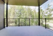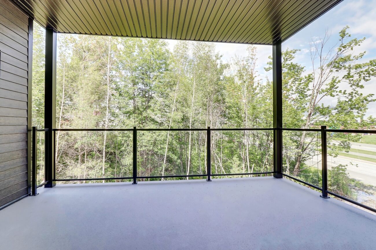 Zone de préservation face à l’immeuble avec vue sur un parc boisé rempli d’espace vert, qui vous procure un endroit calme et paisible.