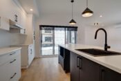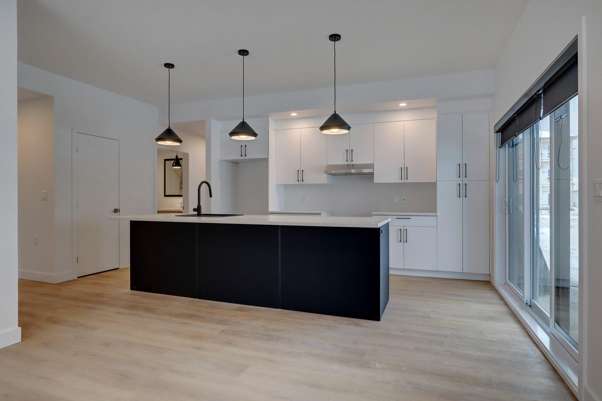 -Cuisine moderne incluant une table de salle à manger intégrée à l’îlot de cuisine