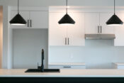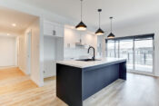 -Cuisine moderne incluant une table de salle à manger intégrée à l’îlot de cuisine