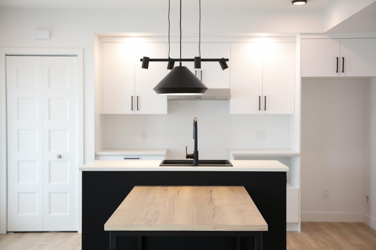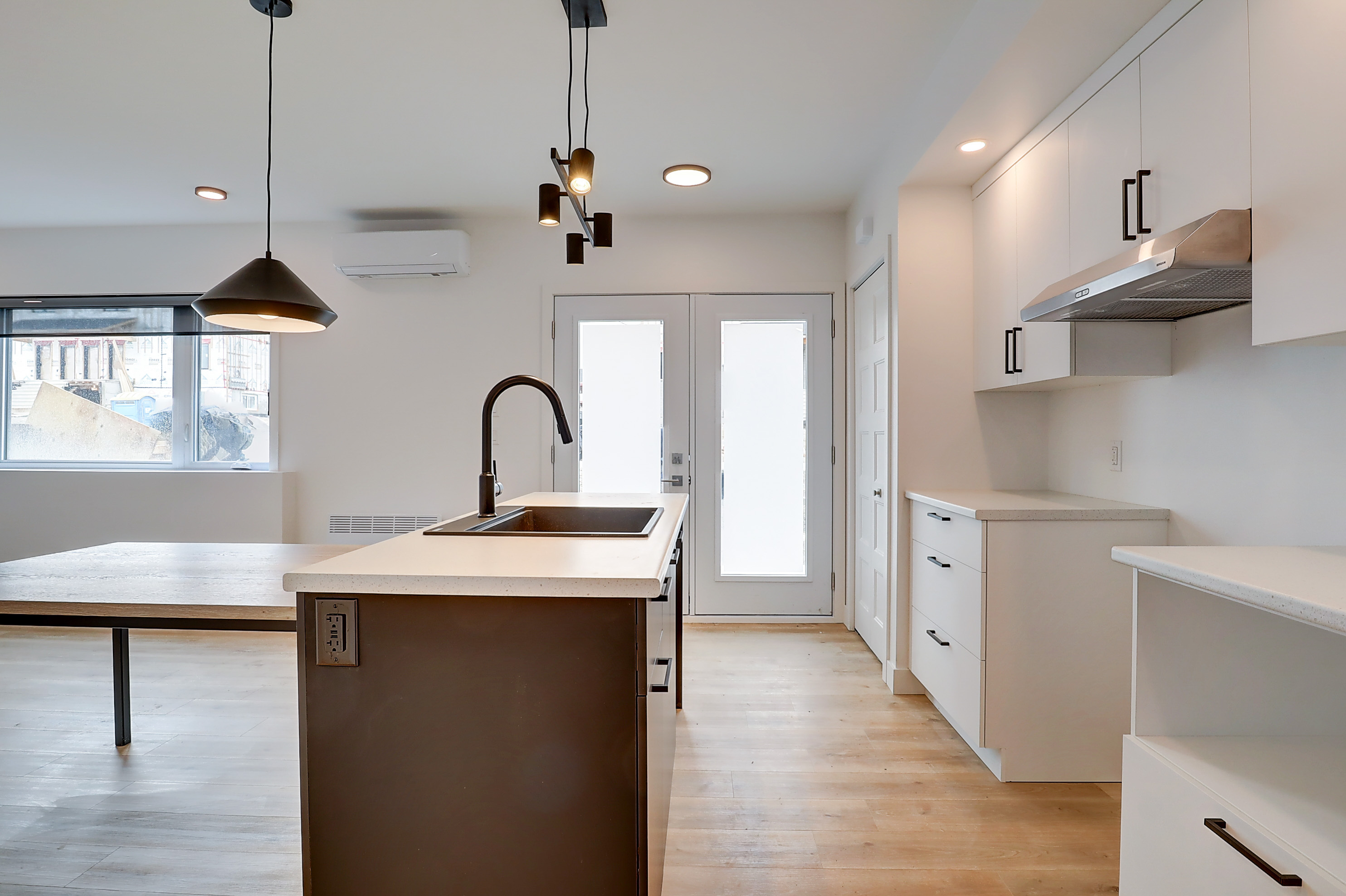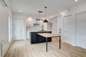 -Cuisine moderne incluant une table de salle à manger intégrée à l’îlot de cuisine
