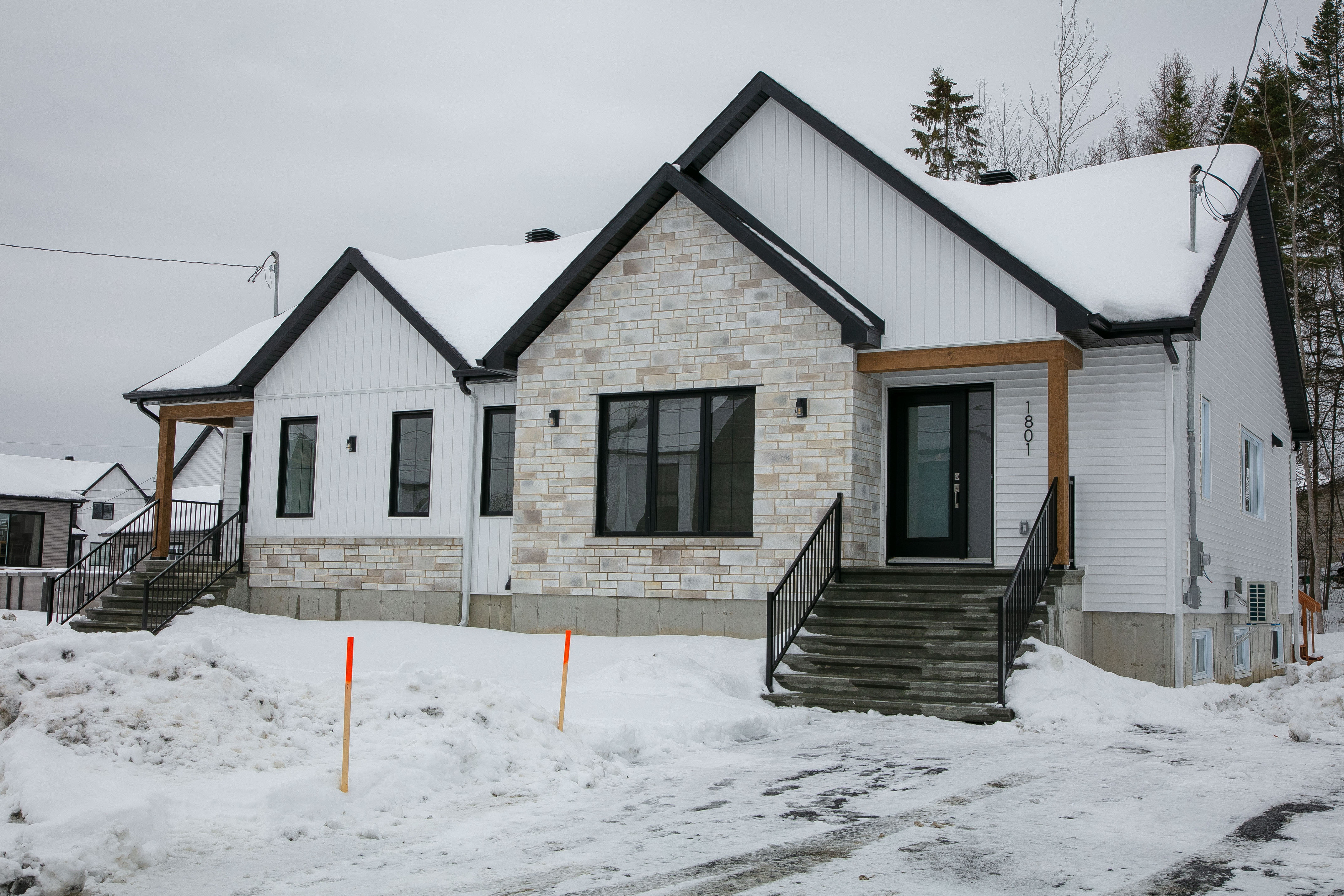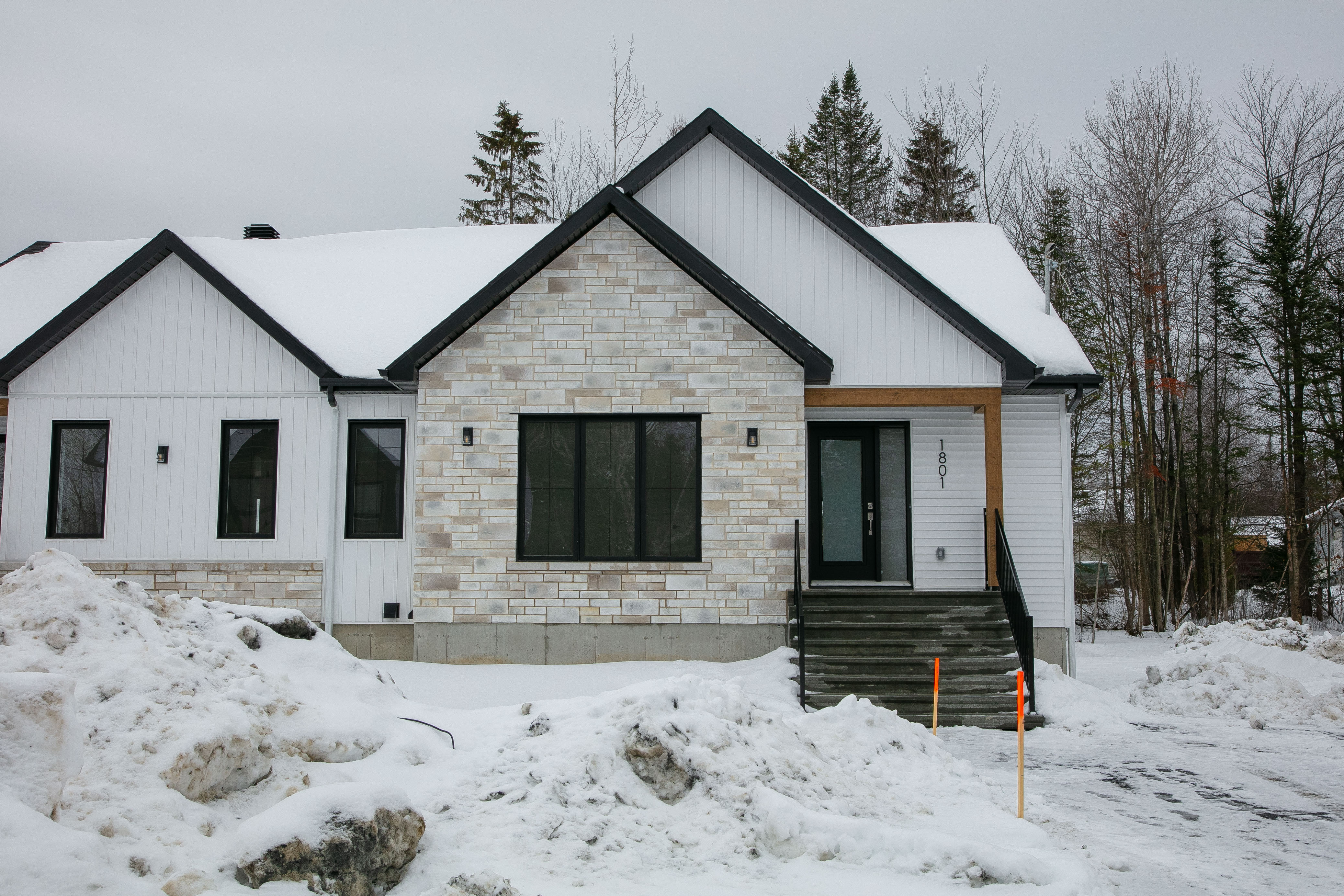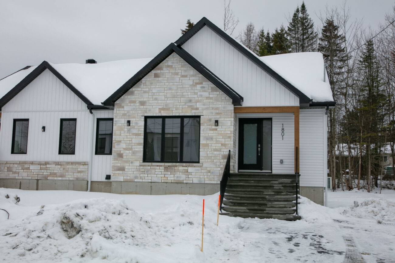 Vinyle verticale, brique, pierre, fibrociment, bois ou acier à l'avant (partiellement obligatoire)