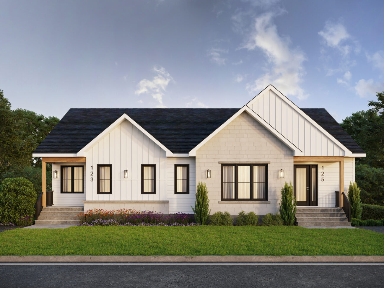 Vinyle verticale, brique, pierre, fibrociment, bois ou acier à l'avant (partiellement obligatoire)